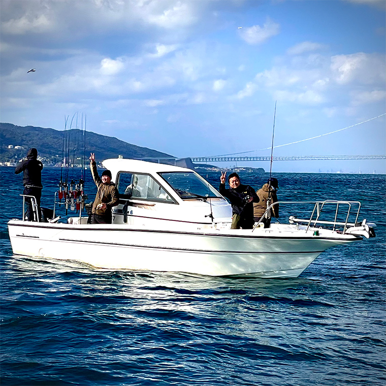 明石海峡や紀淡海峡での本格オフショアフィッシングは、このボートにお任せ下さい。乗り合いは8名様を上限にしているので、デッキを広々とご利用いただけます。